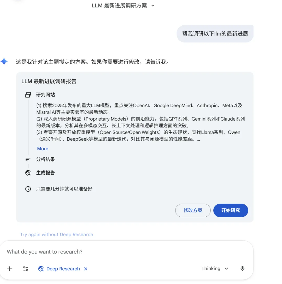 针对于写论文需求的朋友来说,Deep Research绝对是不可错过的一大利器,Gemini会首先给出调研方案,我们点击开始研究后Gemini便会在全网收集相关资料。