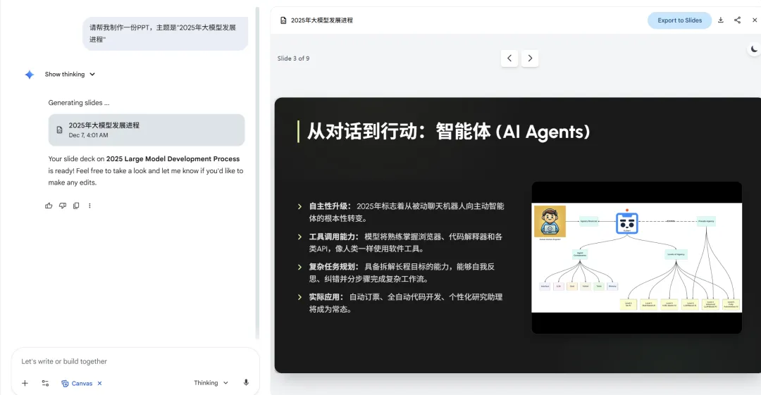 Gemini还能帮我们一键生成ppt,我们只需要给出主题和要求(当然越详细越好哈,我这边只是演示)。
