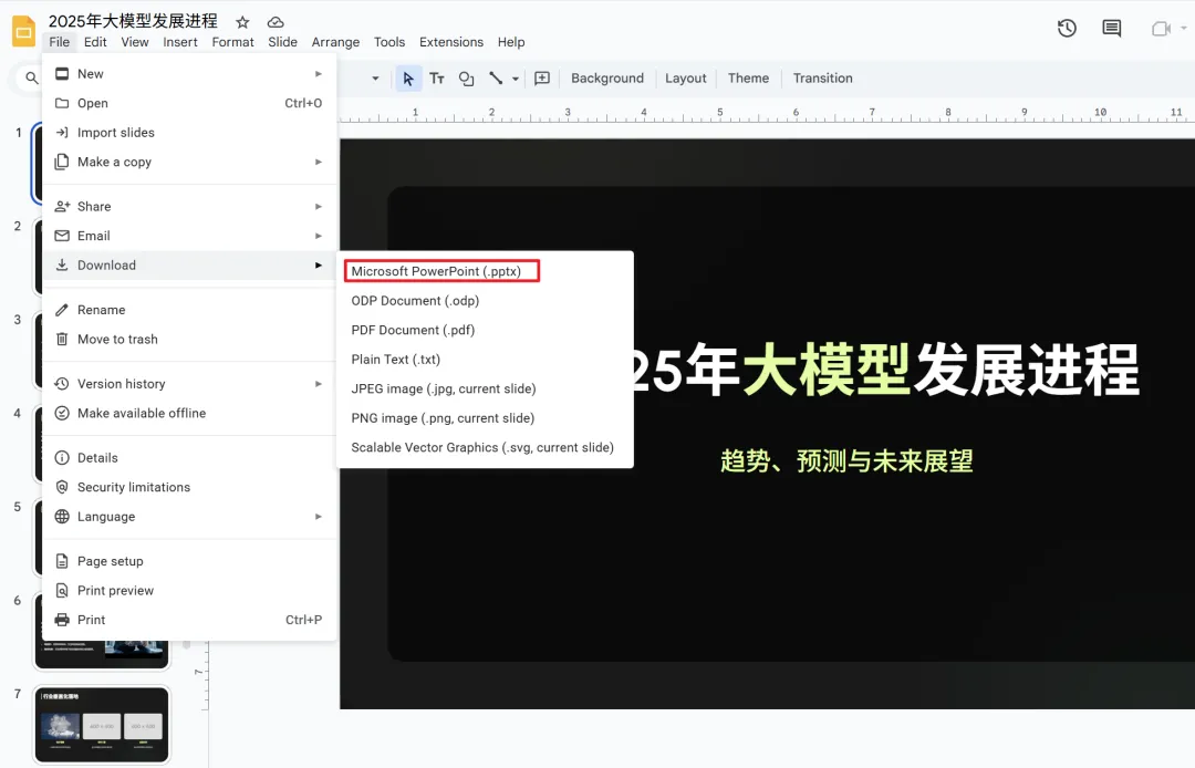 生成完成后,我们点击右上角的export to slides,然后选择以pptx格式下载就能直接下载ppt啦~