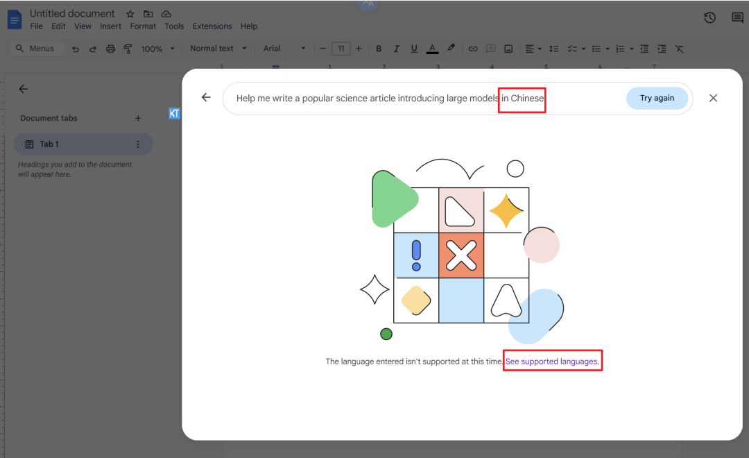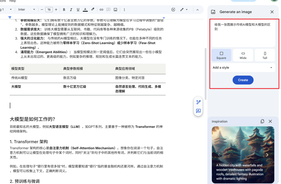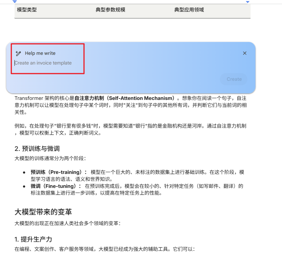 在谷歌文档中,我们可以让AI自动给我们生成文章,注意这里的输入语言不接受中文,我们需要用英文提出需求,并约束Gemini以中文输出,这里我们让他写一篇介绍大模型的文档。