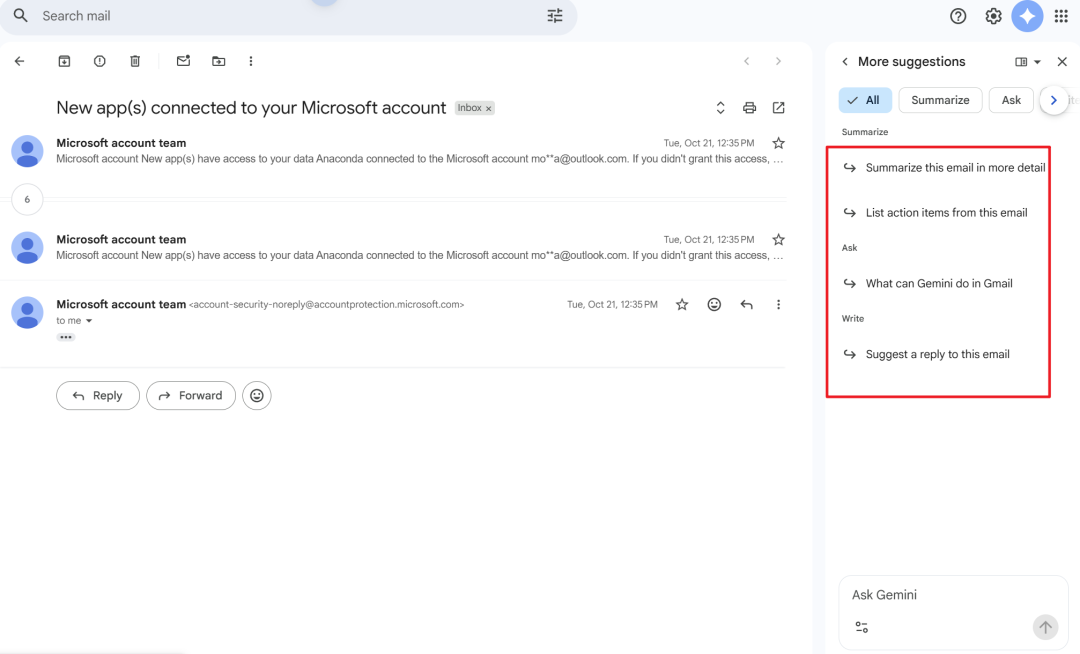 通过Gemini,我们可以快速总结邮件内容、列出邮件要点以及自动生成答复等。